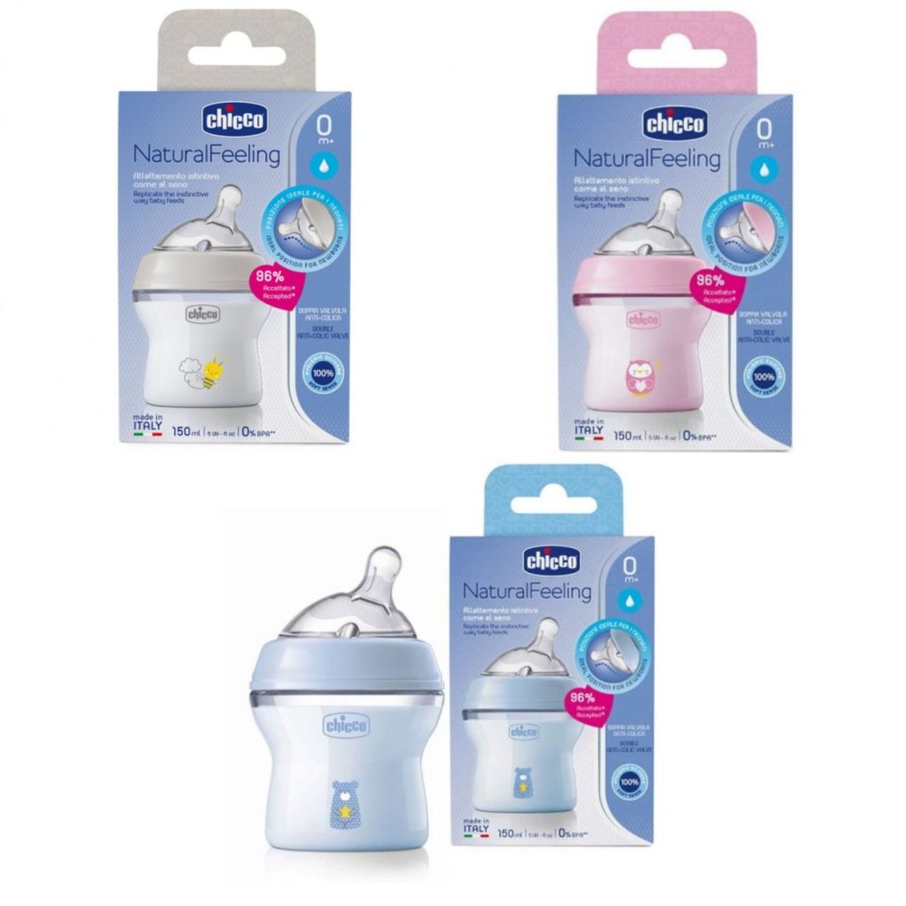 شیشه شیر چیکو مدل نچرال فیلینگ 150 میلی‌لیتر ضدنفخ با سری سیلیکونی